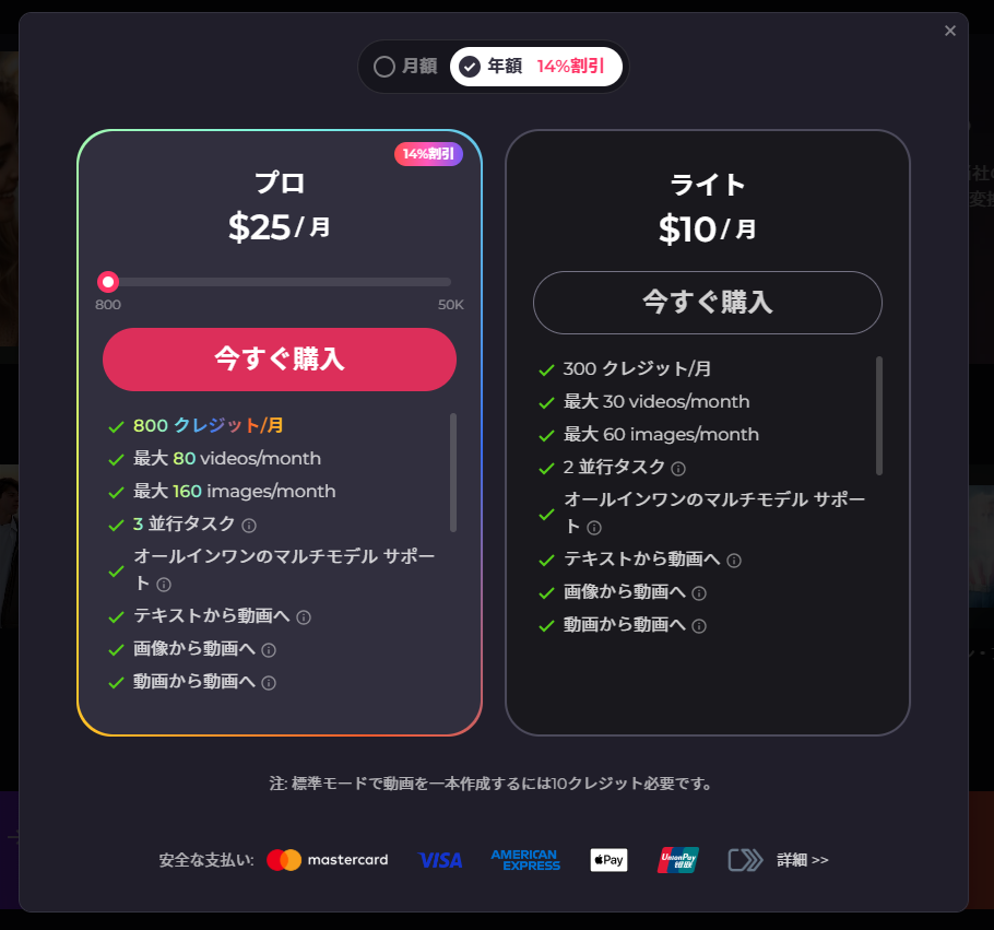有料プランはライトとプロがございますが、プロは月毎のクレジットを調整する事ができ、購入した分だけサブスクリプションの値段が上がる仕組みとなっています。
