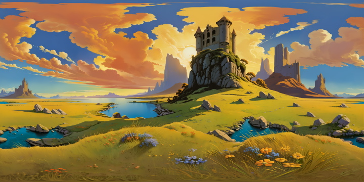 プロンプト例:overgrown castle ruins in a wide open grass plain, wild flowers and scattered boulders, a blue river, distant mountains, golden hour, wispy clouds (広々とした草原に生い茂る城跡、野の花と散乱する岩、青い川、遠くの山々、ゴールデンタイム、うっすらと浮かぶ雲。)